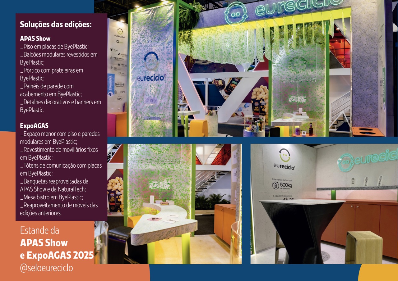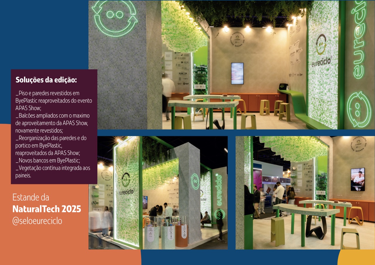 O Estande Circular – Case Eu Reciclo redefine o conceito de arquitetura efêmera com um projeto 100% circular. Com módulos reutilizáveis e adaptáveis, o estande criado para celebrar os 10 anos da Eu Reciclo foi utilizado em quatro grandes feiras e desviou mais de 2,7 toneladas de plásticos de aterros. Construído com ByePlastic®, material desenvolvido a partir de resíduos plásticos reciclados por cooperativas, o projeto alia estética contemporânea, rastreabilidade e responsabilidade socioambiental. Desenvolvido e implementado em um ambiente real de mercado, o estande comprova a viabilidade da economia circular em contextos complexos. Cada elemento foi pensado para montagem, desmontagem e reaproveitamento total, reduzindo emissões e consumo de recursos. A iniciativa gera renda para cooperativas locais, promove inclusão produtiva de mulheres e comprova a viabilidade da economia circular no setor de eventos, transformando resíduos em valor e inovação.