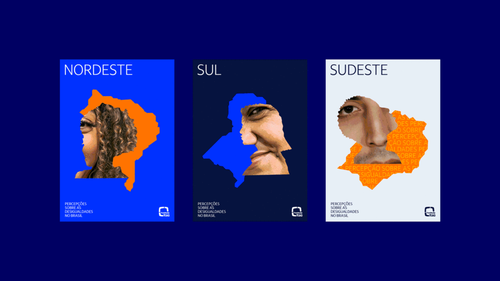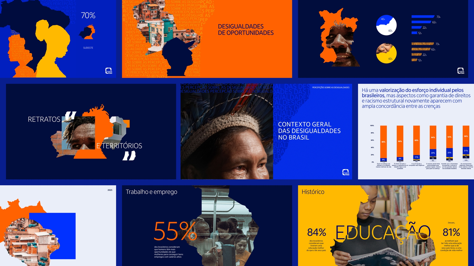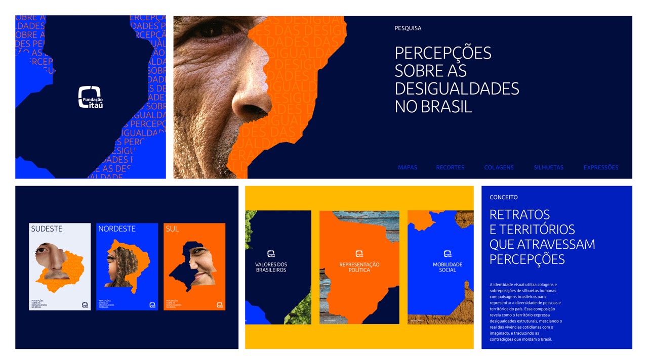 A pesquisa Percepções sobre as Desigualdades, do Observatório da Fundação Itaú, recebeu uma identidade visual desenvolvida para traduzir dados complexos de forma clara, sensível e acessível. O projeto une design de dados e linguagem visual para ampliar o debate sobre desigualdades no Brasil, combinando rigor técnico e profundidade humana. Colagens e sobreposições de silhuetas com paisagens nacionais expressam diversidade e contrastes, enquanto a estrutura multiplataforma garante consistência entre ambientes digitais e impressos. Sustentável e inclusiva, a proposta reduz o uso de materiais físicos e fortalece a compreensão por diferentes públicos, transformando informação em ferramenta de reflexão e cidadania.