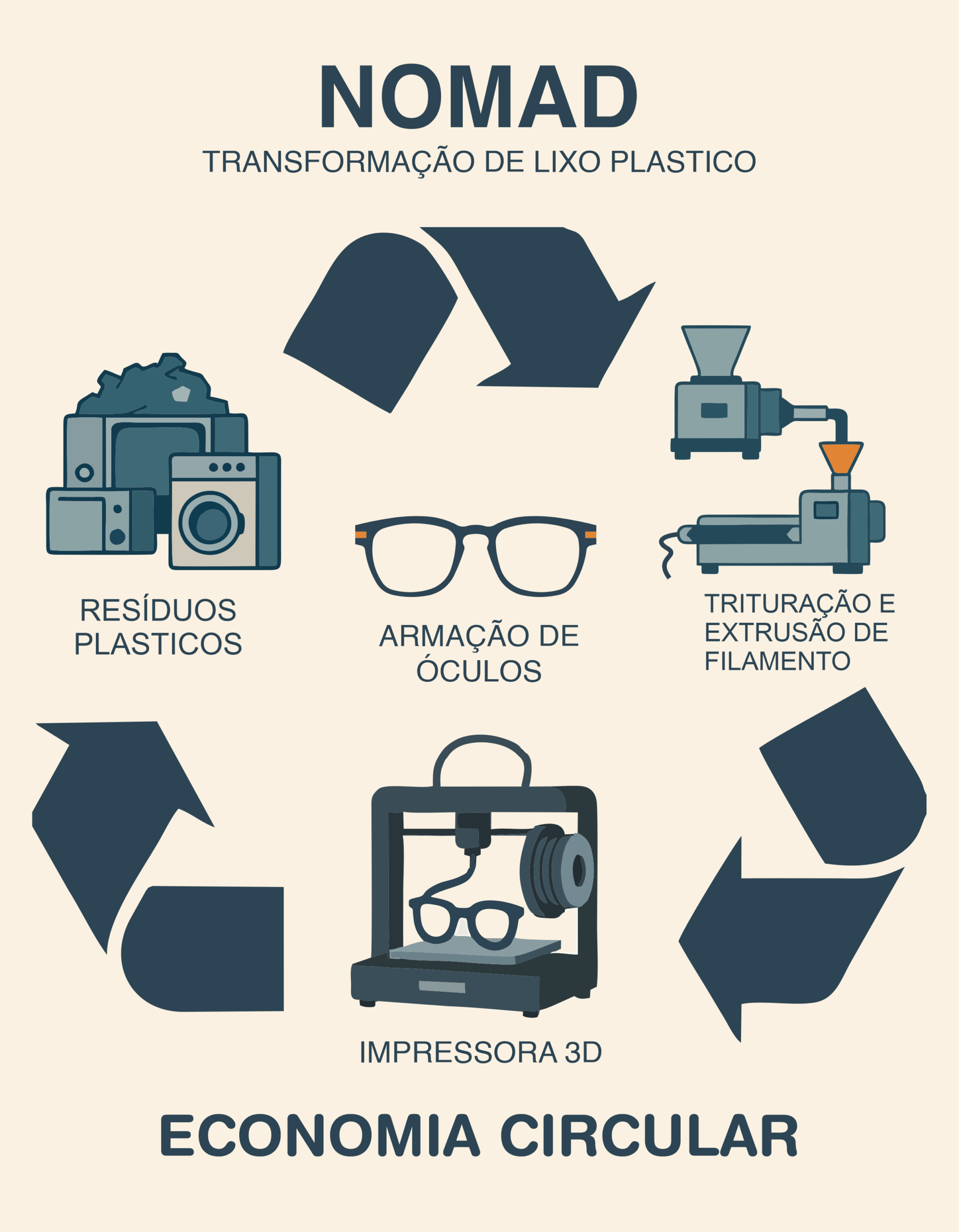 O Projeto NOMAD propõe um modelo inédito de sustentabilidade urbana desenvolvido na Rocinha (RJ) pela parceria entre Maré, PUC-Rio e DASA. A iniciativa transforma resíduos plásticos de baixo valor comercial em armações de óculos, por meio de manufatura aditiva e reciclagem distribuída, com redução de até 99% nos custos e 75% no consumo energético em relação a processos convencionais. Com design voltado à simplicidade e precisão, o sistema elimina componentes metálicos e facilita a operação por pessoas sem formação técnica. O projeto alia eficiência tecnológica, impacto social e responsabilidade ambiental, ao gerar renda e qualificação para jovens, reduzir resíduos locais e democratizar o acesso a produtos essenciais, transformando passivos ambientais em ativos socioeconômicos para comunidades periféricas.
